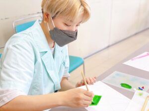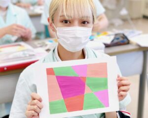 美容学科2年生【デッサン🎨】 2021.07.14 こんにちは☁️ 本日は美容学科2年生の造形の授業にお邪魔しました! まず15×20の長方形を書きます! その後直線を5〜9本書き12〜15個のマスを作っていきます! 各自テーマを決めて、3〜5色を使って描いておりました🎨 配色や色の作り方等学んだ事を活かしてデッサンしておりました🌈🌈 「どの色混ぜたら黒になるかな?」 「もっと鮮やかな色がいいな」等、友人同士聞きながら色を作っておりました! どれも個性が溢れており、とても素敵でした✨✨ 穏やかな雰囲気で授業が行われておりました❕ 一覧へ戻る